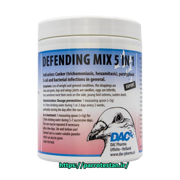 Defending Mix 5-in-1 از برند معتبر DAC هلند یک داروی ترکیبی قوی است که برای درمان و پیشگیری چند بیماری شایع در پرندگان زینتی مانند تریکومونیازیس (Canker)، هگزامیتیا، سالمونلوز (Paratyphoid)، عفونتهای E.Coli و سایر عفونتهای رودهای طراحی شده است.