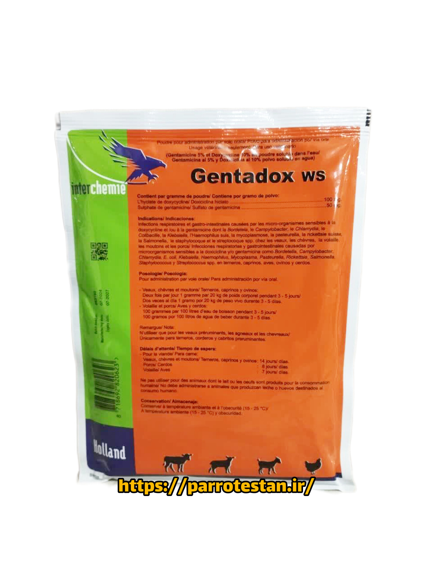 جنتادوکس WS اینترشیمی (Interchemie Gentadox WS) پودر آنتی‌بیوتیک محلول در آب با ترکیب دکسی‌سیکلین و جنتامایسین؛ مناسب برای درمان عفونت‌های گوارشی و تنفسی در کبوتر، پرندگان زینتی و طیور. دوز مرجع: 1 گرم در 1 لیتر آب به مدت 3–5 روز (با مشورت دامپزشک).